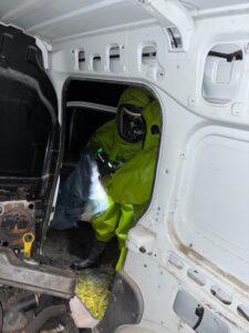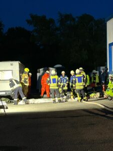 Vor Ort bot sich den Einsatzkräften eine unübersichtliche und komplexe Lage mit mehreren Gefahrenquellen. So musste ein auf „Chlor“ umgelabelter Gas-LKW erkundet und messtechnisch überprüft werden. Darüber hinaus stellte ein Kastenwagen mit gefährlichem Stückgut eine weitere Einsatzstelle dar, die ebenfalls eine detaillierte Erkundung erforderte. Im Verlauf der Übung wurde zudem ein Pkw entdeckt, in dem sich eine bewusstlose Person befand. Diese musste unter Atemschutz aus dem Fahrzeug gerettet werden. Zusätzlich trat aus einem beschädigten Behälter Salzsäure aus, sodass weitere Sicherungs- und Abwehrmaßnahmen notwendig wurden.