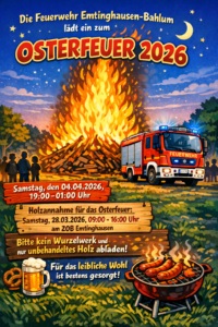 Die Feuerwehr Emtinghausen-Bahlum lädt herzlich zum traditionellen Osterfeuer 2026 ein. Am Samstag, den 04.04.2026, von 19:00 bis 01:00 Uhr, möchten wir gemeinsam mit euch einen gemütlichen Abend am großen Osterfeuer verbringen.